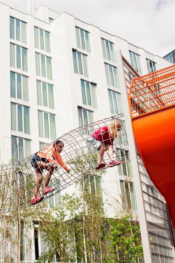 I hjertet av Oslobukta finner du en flunkende ny lekeplass. Her kan man svinge seg i brannmanstang, prøve seg på klatreveggene og kaste seg ut for sklien! Blir det varmt er det bare å kjøle seg ned i fontenen ved siden av og kanskje fylle på med en bolle fra Godt Brød etterpå.